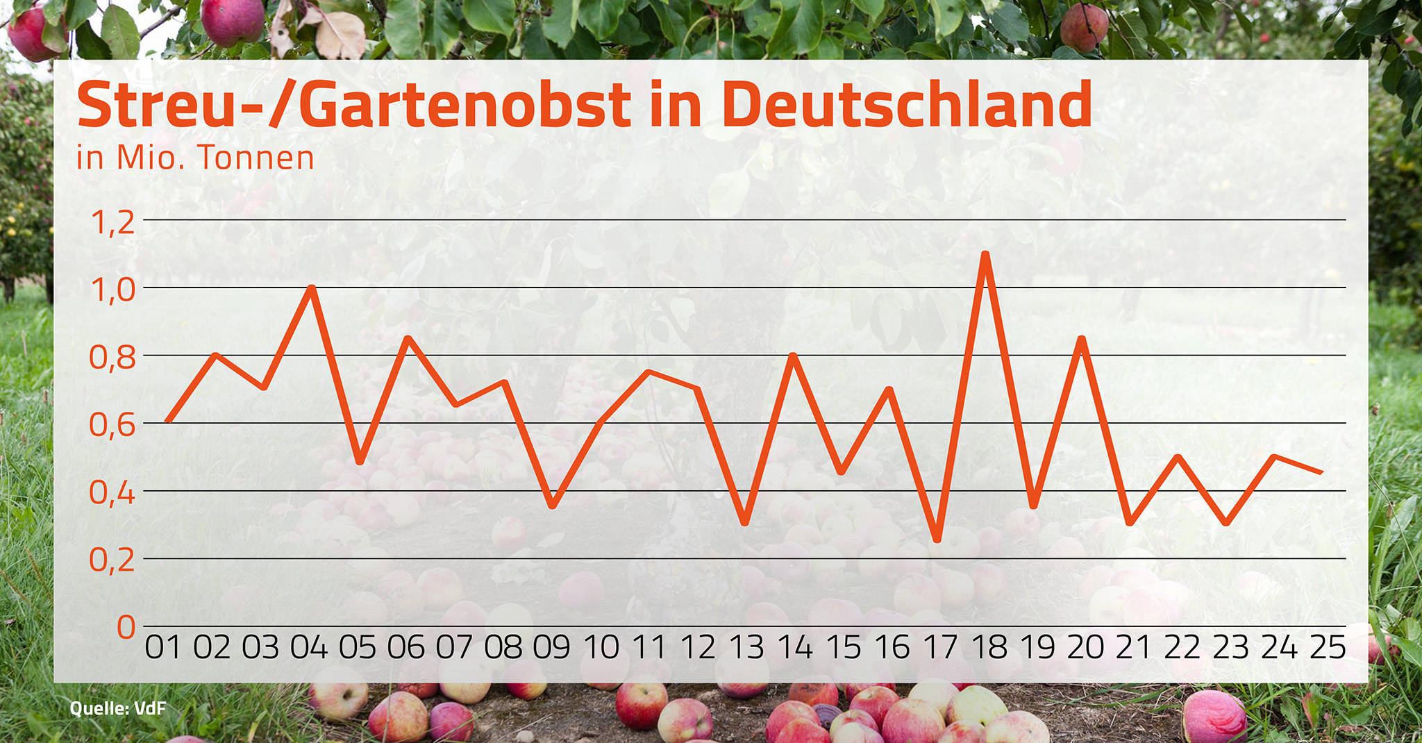 Generell hat die Ertragskapazität von Streuobst in den letzten Jahren stark gelitten. Während im Jahr 2018 noch über 1 Mio. Tonnen prognostiziert worden waren, ging vor allem durch die Trockenheit der Dürresommer zwischen 2019 und 2023 das Ertragspotenzial zurück. Immer mehr Bäume sind aufgrund der unzureichenden Wasserversorgung und ihres Alters von über 70 Jahren stark geschädigt.