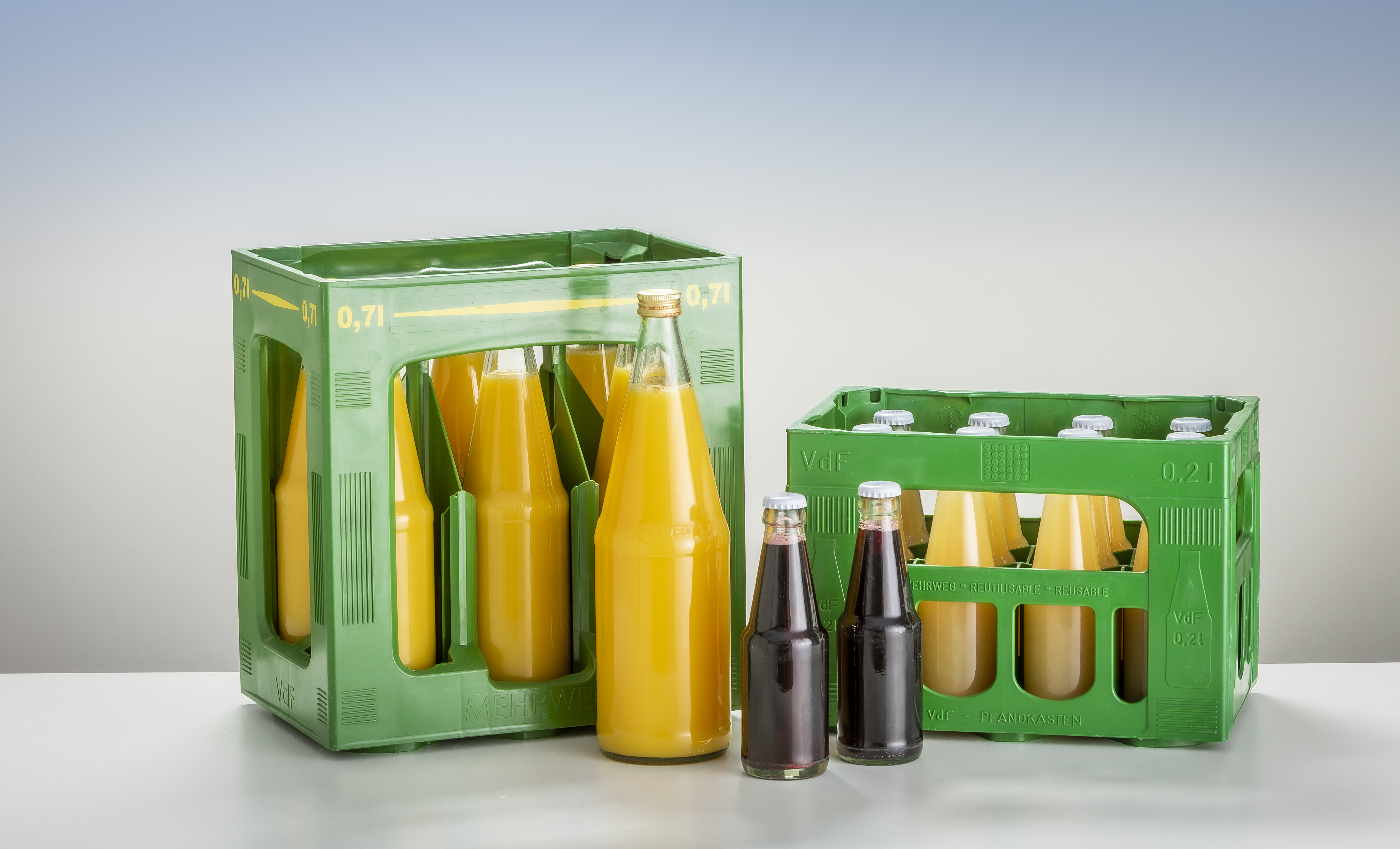 Die seit rund 50 Jahren bewährten VdF-Mehrweg-Flaschen für Fruchtsäfte werden jetzt 11 Prozent leichter. Die 0,7-Liter-Flasche wiegt künftig 400 statt 450 Gramm, die 1,0-Liter-Version 535 statt 600 Gramm. Das spart Material, CO2 und Logistikkosten - bei gleichbleibender Qualität.